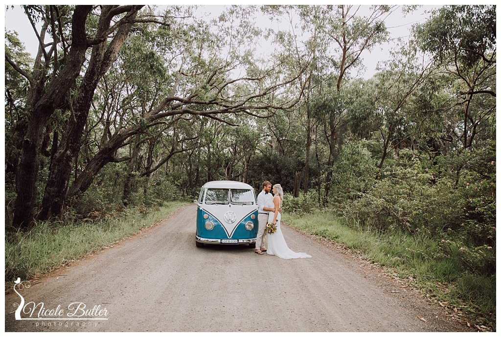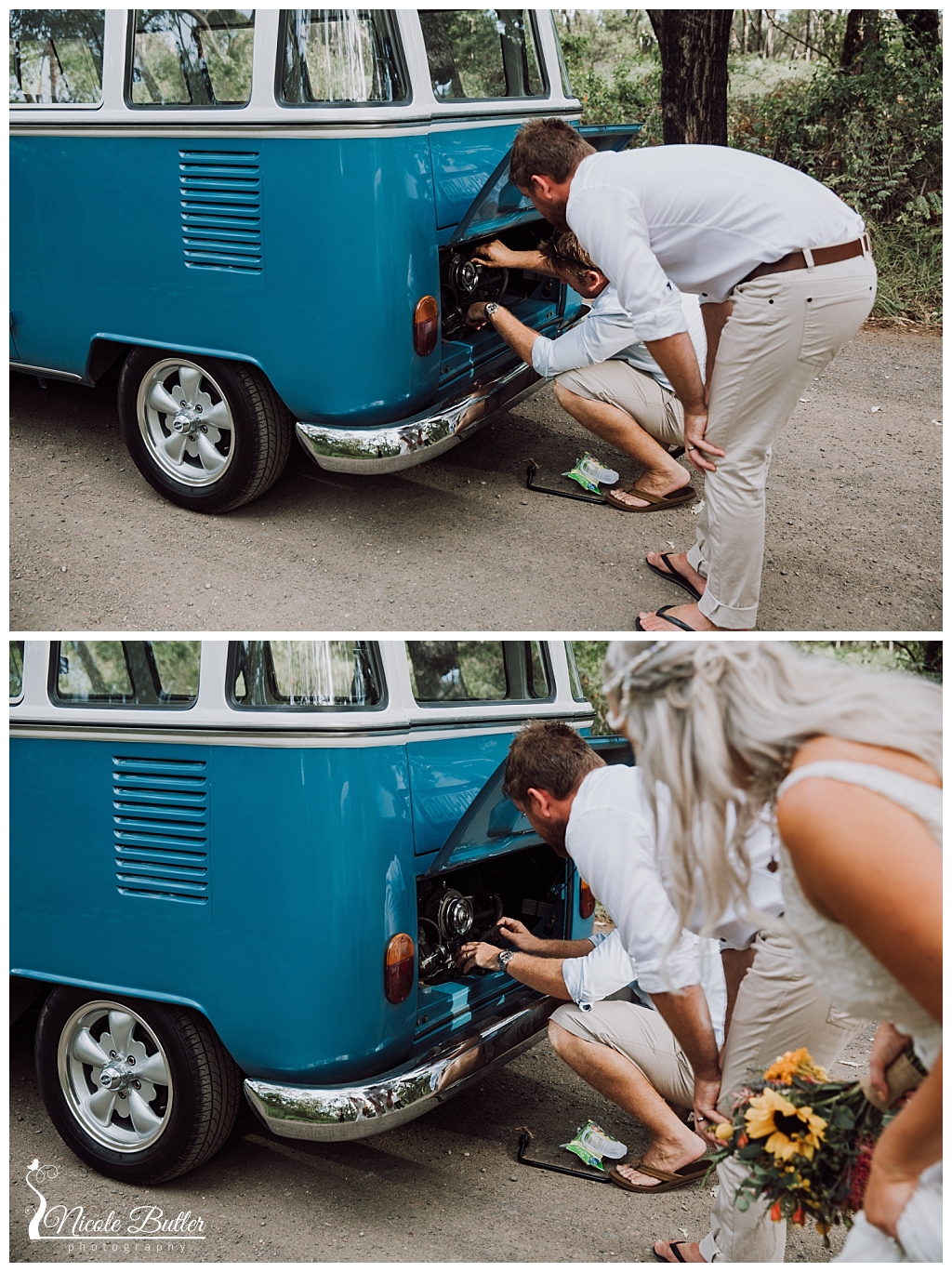 So no one can plan for some events that may happen on the wedding day and when the Kombi broke down just as we arrived at Naru it was all hands on deck including groom Dan. Well from a photographers point of view it looks as if it was very strategically placed to photograph!